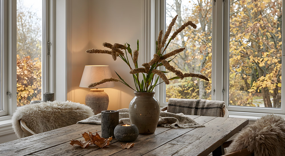 I både hem, kontor och offentliga miljöer bidrar höstblommor till en känsla av stabilitet och ro. De kompletterar inredningen snarare än dominerar den, och fungerar väl tillsammans med trä, textilier och naturmaterial.