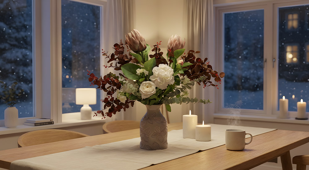 Vinterblommor bidrar till ett avskalat och harmoniskt uttryck i inredningen. Genom neutrala färger, tydliga former och genomtänkta placeringar skapar de en lugn helhet som passar säsongen. Med konstgjorda vinterblommor får du samma estetik – kombinerat med hållbarhet, kvalitet och minimal skötsel.