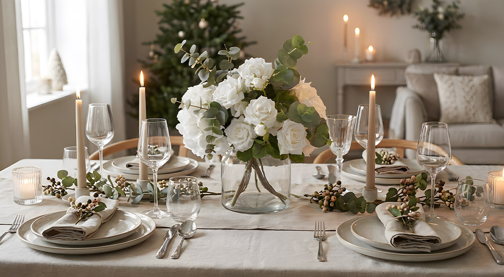 Hem / Konstblommor tips / Inredningsidéer / Blommor på matbordet – vardag vs fest
